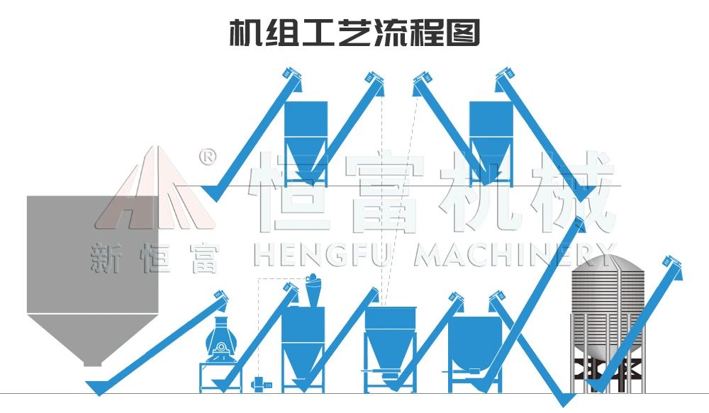 該條生產線包含設備有:烘幹機(客戶自有)、圓筒原料初清篩、2台水滴型飼料粉碎(suì)機(jī)、2台脈衝飼料除(chú)塵器、2個(gè)30m3鍍鋅料(liào)塔、2個2m3待粉(fěn)碎倉、包裝碼垛(duǒ)設備、提升輸送設備以及控製係統等。