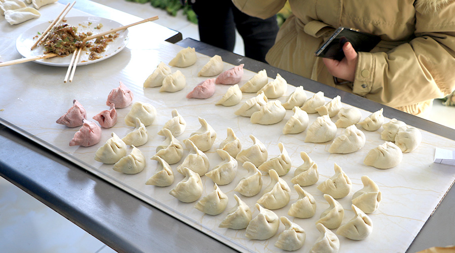 不一會兒,一排排獨(dú)具個性,形態各異的餃(jiǎo)子就排滿了桌子。無論包得快(kuài)與慢、好與差(chà),大家都忙在手上(shàng),樂在臉上,喜在心裏,活(huó)動現場歡笑聲不(bú)斷,氣氛火熱。