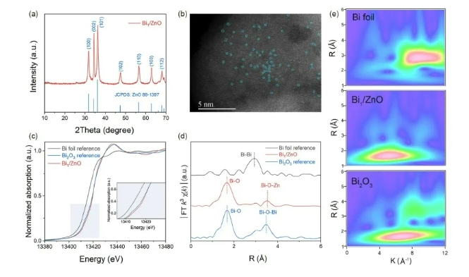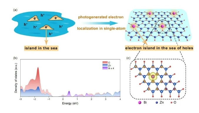 對此(cǐ),中國科學院(yuàn)高能物理研究所的鄭黎榮副研究員與中國科學技術大(dà)學謝毅教授和張曉東教授課題組提出了(le)一(yī)種光生電子島策略來促進光生載(zǎi)流(liú)子(zǐ)的有效分離,從而實現了常溫常壓下(xià)的光催化二氧化碳化學固定(dìng)為環狀碳酸酯反應。通過簡(jiǎn)單的濕化學法,表麵負載Bi單(dān)原子的ZnO納米片(Bi1/ZnO)催化劑被成功合成,同時通過(guò)HAADF-STEM和XAFS表征證(zhèng)實了Bi單原子的存在,基於擬合結果確定Bi原子與3個O原(yuán)子進行配位。進一(yī)步地(dì),分子動力學模(mó)擬顯示Bi1/ZnO具(jù)有良好的結(jié)構穩定性,同時徑向分布(bù)函數(shù)分析(xī)表明(míng)Bi單原子的配位數以及配(pèi)位鍵長均與XAFS的測試結果相吻合。原位XPS顯示,在光照的條件下,光生電子局域在Bi單原子附近,形成光生電(diàn)子島,而(ér)光生空穴離域在ZnO基(jī)底之中,形成“空穴海”,這與理論計算態密度中Bi單(dān)原子僅對(duì)催化劑整體的導帶有貢獻的結果相一致。PL、光電流以(yǐ)及電子阻抗譜等光(guāng)電化學測試證明了Bi單原子介導的光生電(diàn)子島有效促進了光生載流子的分離。