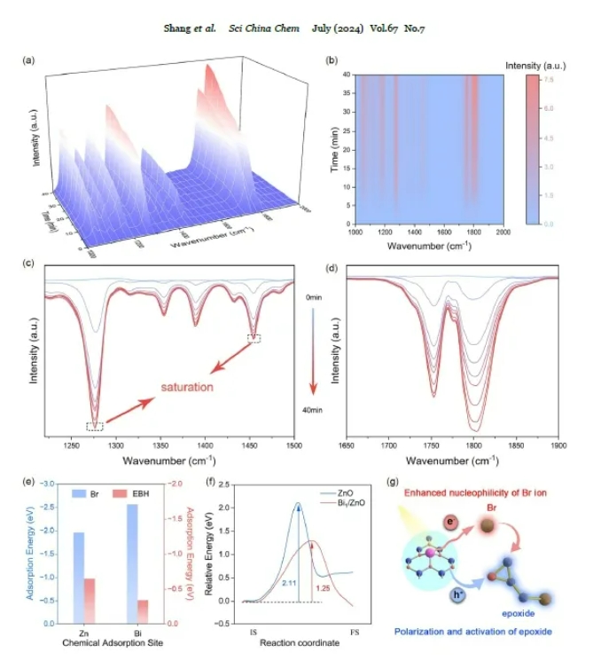 原位紅外光譜顯示Bi1/ZnO催化劑可以在常溫(wēn)常壓地條(tiáo)件下有效地促(cù)進環氧(yǎng)化物的開環過程(chéng)。原位ESR和DFT過渡態計(jì)算表明,離(lí)域在ZnO基底中的光生空穴可以傳遞至環氧(yǎng)化物(wù)三元環中的氧原子上,使得三元環發生極化活化,更有利(lì)於被進攻(gōng),而Bi單原子介導的光生電子島可以將電子傳遞至助催化劑TBAB中的Br離(lí)子上,增強了其親核性,更容易進攻環氧化物三元環上的C原子,完成C-O鍵(jiàn)的斷裂,最終完成開環過程。基於此,Bi1/ZnO催化劑可以在模擬太陽光和常溫常壓的條件下實現二氧化碳和溴代環氧丙烷直接合成(chéng)溴(xiù)代碳酸丙烯酯(zhǐ),產率高達90%,且(qiě)具有良好的(de)循環穩(wěn)定(dìng)性。這項研(yán)究不僅揭示了(le)環氧化(huà)合物的詳細光催化開環(huán)過程,還為構建高效的二氧化碳利用和(hé)轉化的光催化係統提供了有前景的方法。