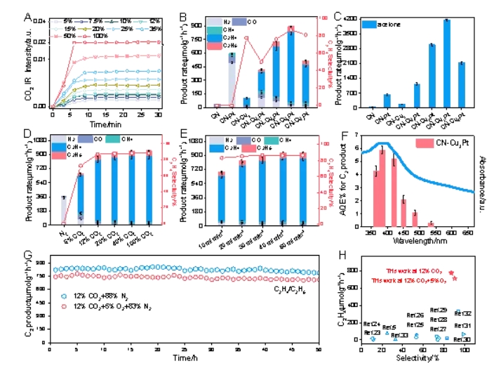 圖 1, 光催化 CO₂ 還原(yuán)耦合異(yì)丙醇(IPA)氧化(huà)。(A) 不同 CO₂ 濃度條件下,CO₂ 在 N₂ 氣氛中的(de) ATR-FTIR 吸附峰強度。(B) 所製備催化劑的光催化氣體產物生成速率。(C) 在 12% CO₂/N₂ 稀釋氣氛中,光催化 IPA 氧化產物生成速率。(D) 使用 CN-Cu₃Pt 在不同 CO₂ 濃度下(流速 30 ml/min)的氣體產物生成速率。(E) 在 12% CO₂/N₂ 混(hún)合氣氛中,不同流速條件下(xià) CN-Cu₃Pt 的氣體產物生成速率。(F) C₂ 產(chǎn)物(C₂H₄/C₂H₆)在特定入射波長下的量子效率,以及 CN-Cu₃Pt 的 DRS 光譜。(G) 在優化反應條件下(12% CO₂+88% N₂ 或 12% CO₂+5% O₂+83% N₂),CN-Cu₃Pt 的穩定性測(cè)試。(H) 總結光催化 C₂H₄ 產率及選擇性。