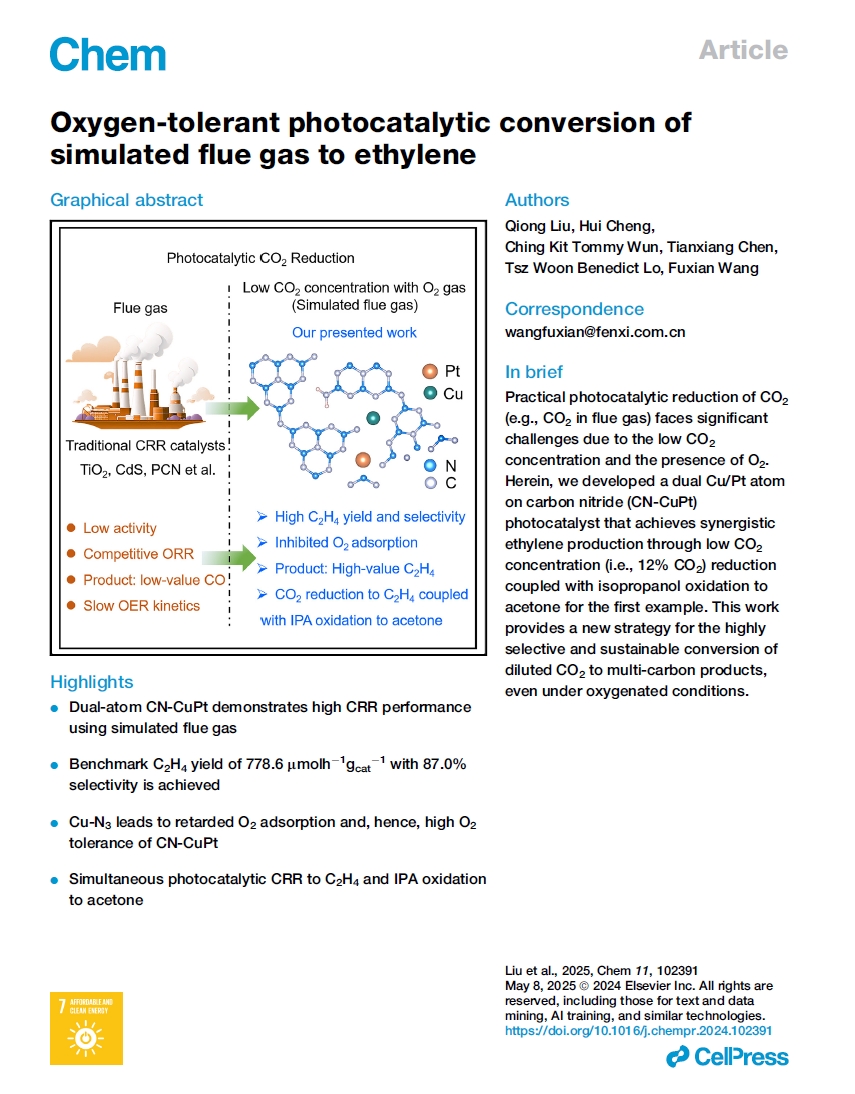 Liu Q, Cheng H, Ching KTW, et al. Oxygen-tolerant Photocatalytic Conversion of Simulated Flue Gas to Ethylene. Chem, 2025. 11, 102391
