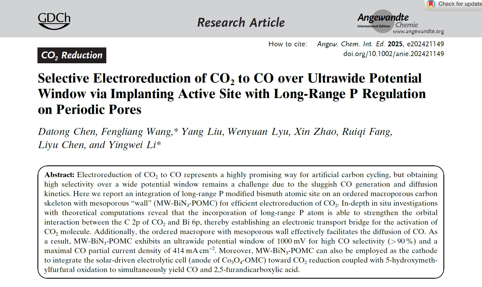 Selective Electroreduction of CO2 to CO over Ultrawide Potential Window via Implanting Active Site with Long-Range P Regulation on Periodic Pores | Angewandte Chemie International Edition