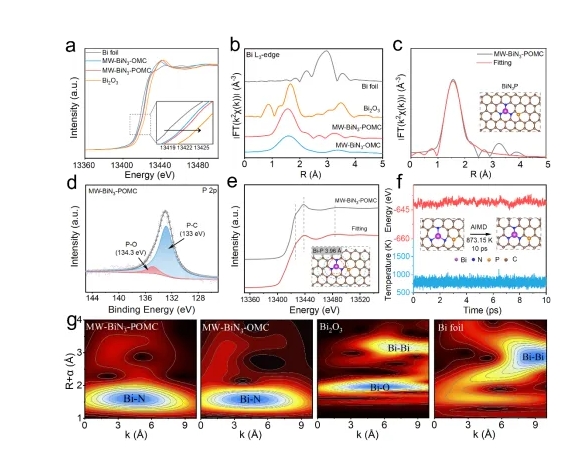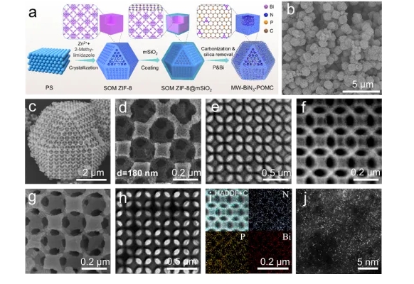 研究(jiū)團隊以金(jīn)屬有機框架(jià)(ZIF-8)為介導(dǎo),通過聚苯乙烯球陣(zhèn)列引導形成有序大孔結構,並引入介孔二氧化矽(mSiO2)作為剛性界麵,經碳化後獲得具有介孔“壁”的有序大孔氮(dàn)摻雜碳(tàn)骨架(圖1)。隨後,通過植酸和(hé)硝(xiāo)酸鉍(bì)前驅體將P和Bi原子(zǐ)植入骨架(jià),最終得到(dào)MW-BiN₃-POMC。球差電鏡與同步輻射(shè)表征證實(shí),Bi以原子級分散(sàn)形式存在(zài),且與周圍3個N配位形成Bi-N3結構(圖2);P原子未直接與Bi成鍵,而(ér)是以長程作用(距離約3.96 Å)嵌入碳骨架,並作為電(diàn)子供體向Bi位點轉移電荷,形成富電子中心。