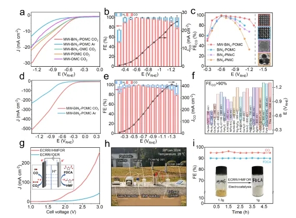 電催化CO2還原性能(néng)測試結果表明,MW-BiN3-POMC 在(zài) 1000 mV 的超寬電位窗(chuāng)口,CO的法拉第效率能保持在 90%以上,且最大CO分(fèn)電流密(mì)度(dù)為(wéi) 414 mA cm-2。此外,利用(yòng)MW-BiN3-POMC作陰極,Co3O4-OMC作為陽極,在太(tài)陽(yáng)能驅動下可同時實現 CO2 還原和 5-羥甲基(jī)糠醛氧化,在製備CO產物的同時獲得高附加(jiā)值的 2,5-呋喃二甲酸產物(圖3)。