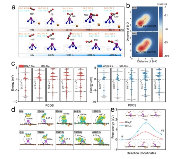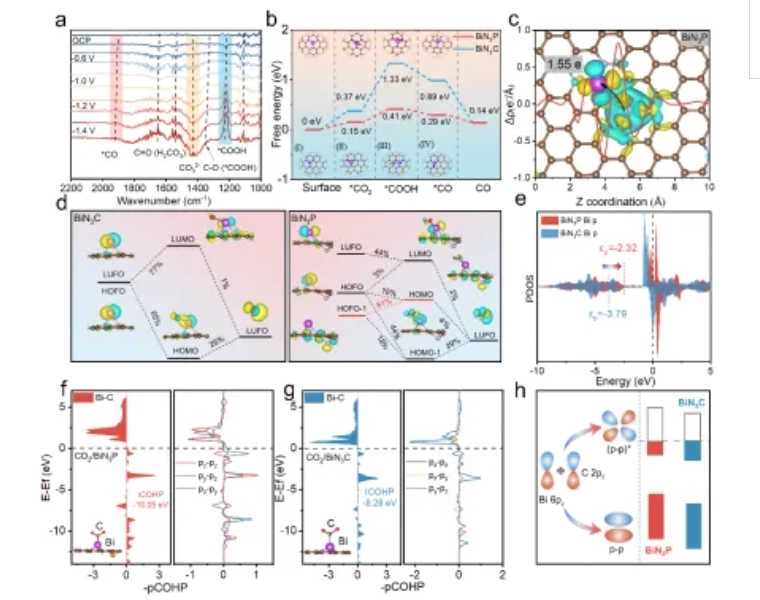文章從原子水平(píng)到分子水平的多尺(chǐ)度分析技術研究了CO產物在Bi位點上(shàng)的形成機製及其在周期性孔內的擴散(sàn)行為。首先采用原位(wèi)拉曼、原位 ATR-IR監測了(le)ECRR的中間體(tǐ)的生成與(yǔ)轉化,並進行密度泛函理論計算,揭示活性位點的CO2還原過(guò)程。此外,采用AIMD 模擬和電荷分解分析,揭示遠程 P 摻雜對Bi 位點上 CO2 分子活化的作用。研究結果表明,P原子的引入(rù)可以強化p-p軌道相互作用(yòng),增強Bi 6p與CO2中C 2p軌道的雜化,以此形成“電子傳輸橋(qiáo)”,促進CO2分子活化(huà)(圖4、5)。有限元模擬也表明,有序大孔(kǒng)結構使得CO的擴(kuò)散速率提升至微孔材料的3倍,且縮小CO與H2的(de)擴散差距,抑(yì)製HER競爭(圖6)。本研究通過“電子結構-孔道結構” 雙維度調控,突破了CO2電還原中活性與選擇性的(de)權衡難題,並揭示p區金屬單原子催化劑中雜原子摻雜的電子調(diào)控(kòng)機製,具有重要(yào)科(kē)學價(jià)值。