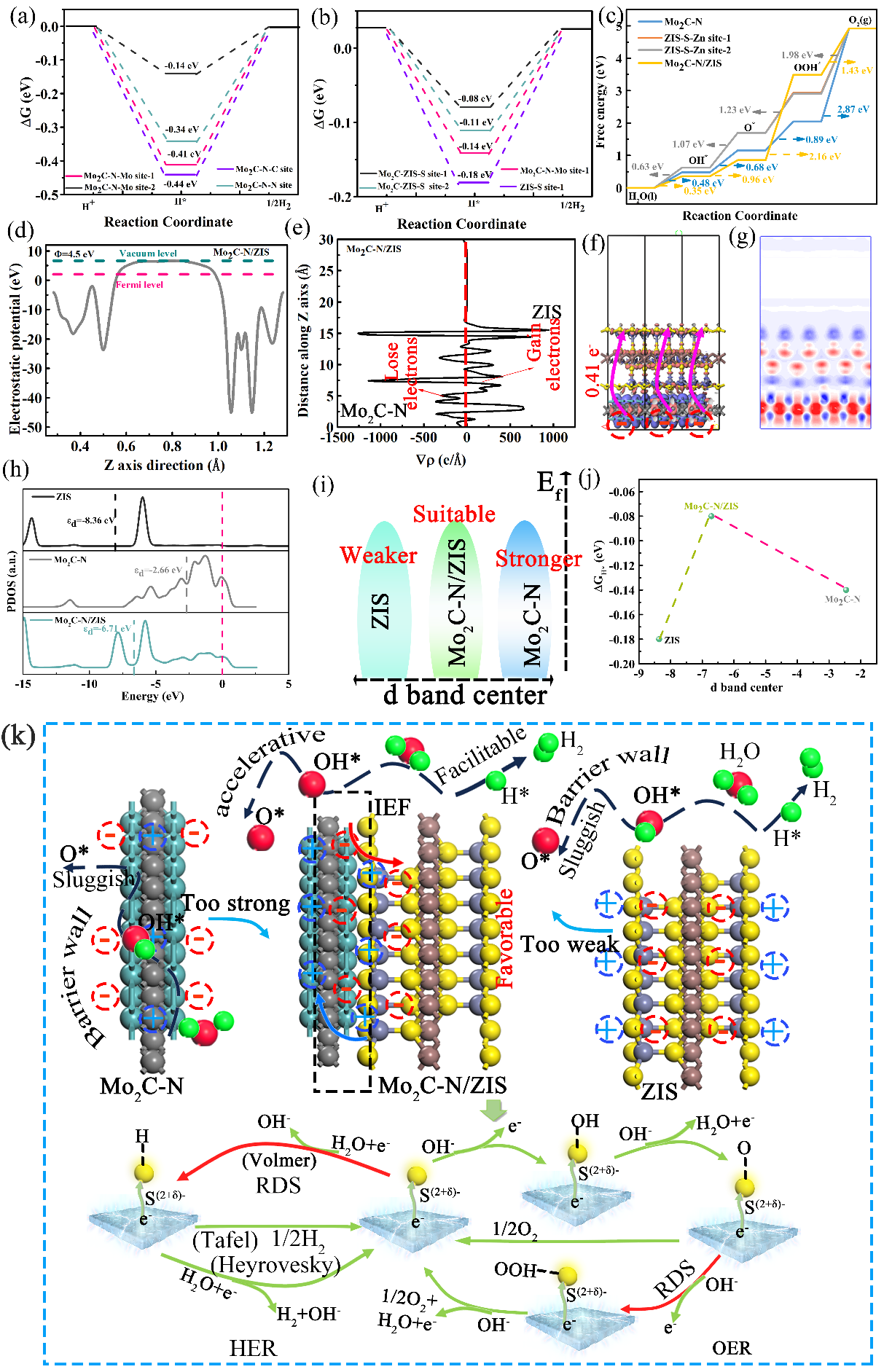 DFT計算表明,Mo2C-N/ZIS 具有合適的氫質子和氫氧中間(jiān)產(chǎn)物的(de)吸附能,加速OER, HER反應速率,Mo2C-N/ZIS的肖(xiāo)特基結具有雙重有利的轉移路線,增強了光生載流子遷(qiān)移,減少了(le)ZIS的本體和表麵複合。此外,原子(zǐ)的重分布電子構型和局部電荷分(fèn)布狀態不僅可以提高本征活(huó)性,還可以調節氫(qīng)和氧中間體的吸附和解吸(xī)行為(wéi)。因此(cǐ),Mo2C-N/ZIS催(cuī)化劑具有良好的PHE/HER/OER性能,是光/電化學應用(yòng)的理(lǐ)想催化劑(jì)。