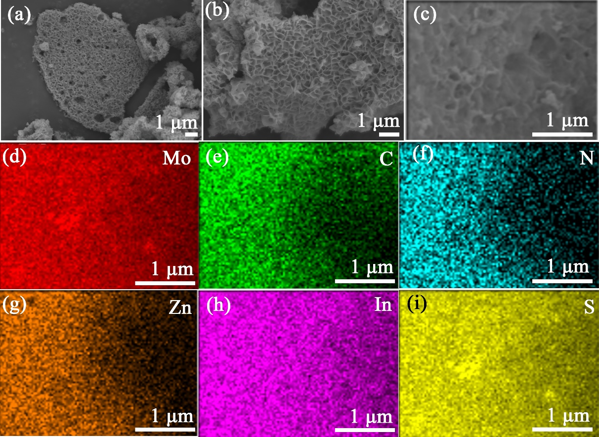圖4 10-a-MoO3@Mo9O26/ZIS, (b) 10-MoO2@C/ZIS, (c) 20-Mo2C-N/ZIS的SEM和元素組成分析(xī)