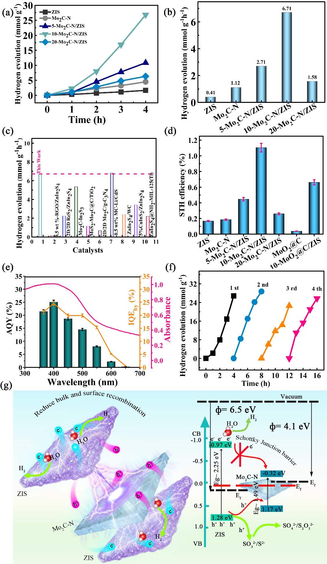 如圖9所示,Mo2C-N/ZIS光催化劑的光催化產氫可高(gāo)達6.71 mmol g-1·h-1, 分別是純ZIS的16.4倍和Mo2C-N的6.0倍,並且高於目前文獻報道的同類反應催化活性。Mo2C-N/ZIS催化劑的太陽能氫轉換(STH)效率高達1.11%,表觀(guān)量子產率實(shí)現了25.06%在入射(shè)光波長為400 nm. 這(zhè)一明顯地提升的催化性(xìng)能和穩定性(xìng)的實現,得益於Mo2C-N/ZIS的合適能(néng)帶結構,更寬的光譜響應範(fàn)圍和更高的光生電子分離(lí)效率。根據密度泛函理論(DFT)結果,ZIS的(de)功函數(6.5 eV)大於半導體Mo2C-N的功函數(4.1 eV), Mo2C-N和ZIS耦合後,由於界麵肖特基勢壘的作用,ZIS導帶附近的光生電子很難沿肖特基結(jié)遷(qiān)移到Mo2C-N表麵,而ZIS價帶的光生空穴可(kě)以(yǐ)轉移到Mo2C-N表(biǎo)麵,形成空間電荷分離區域。此外,表麵或體電荷在肖特基結下有效地抑製了重組,這為H2O的分解(jiě)和表(biǎo)麵氧化(huà)還原反應提供了(le)更多的(de)活化位點。更重要的是,引入的N原子修飾和(hé)調節了Mo2C的電子(zǐ)結(jié)構(gòu),激活了邊緣Mo,為捕獲(huò)高活性的富Mo邊緣原子作為高效(xiào)PHE提供了潛在的支撐。