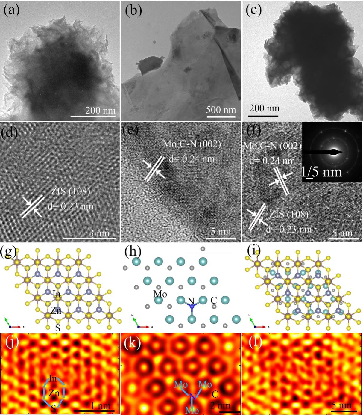 此外,通過透射電鏡(TEM)進一步分(fèn)析證明了超薄2D納米片自組(zǔ)裝成多孔花狀的ZIS,並均(jun1)勻地封裝(zhuāng)在2D Mo2C-N表麵。高分辨(biàn)率透射電鏡(HRTEM)顯示,Mo2C-N/ZIS的晶格條紋分別對應為ZIS (108)晶麵和Mo2C-N 的(002)晶麵。此外,我們進一步(bù)利用掃描透射電子顯微鏡(QSTEM)模擬軟件對ZIS、Mo2C-N和Mo2C-N/ZIS的STEM圖像(xiàng)進行(háng)模擬,以深入了解界麵(miàn)結構關係。在ZIS, Mo2C-N的STEM圖像中可以清楚地觀察到原子的排列。對於Mo2C-N/ZIS,表麵ZIS的原子排列位點(diǎn)受到(dào)明顯影響,這表明Mo2C-N助催化劑的誘導不僅可以改變微觀形貌,還可以影響反應活性位(wèi)點。