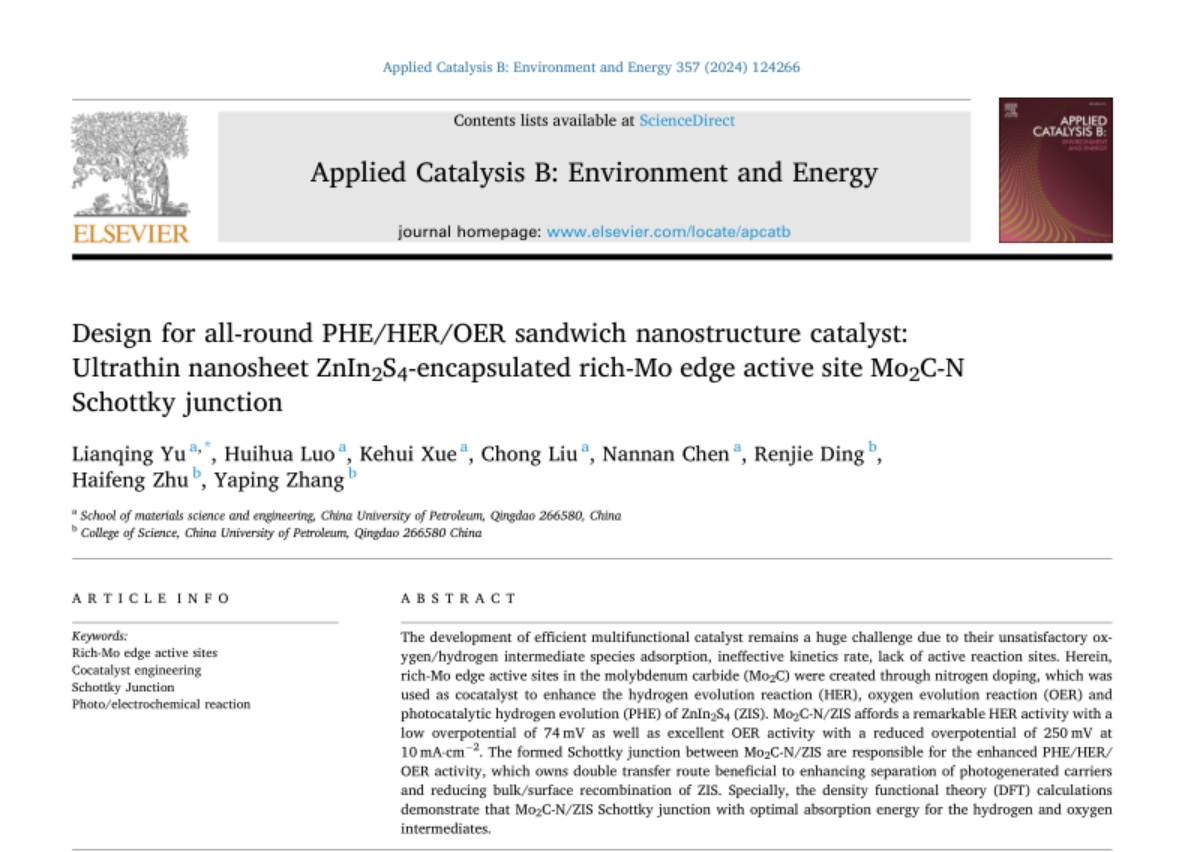 標題: Ultrathin nanosheet ZnIn2S4-Encapsulated Rich-Mo Edge Active Site Mo2C-N Schottky Junction