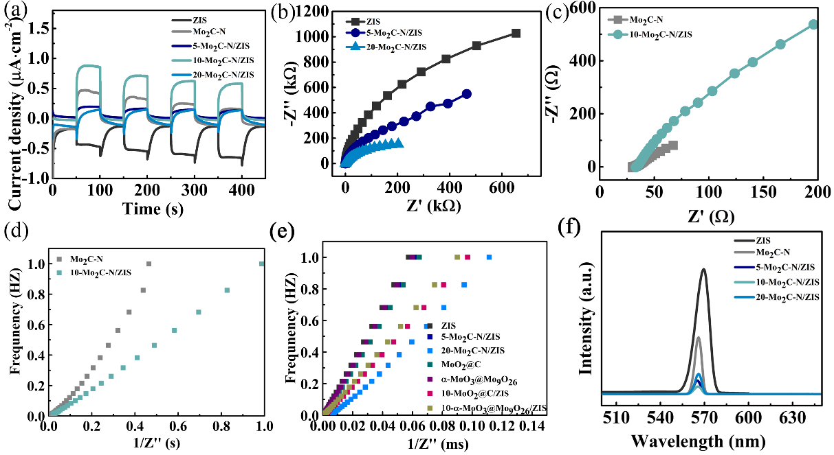 如圖8所示,電化學(xué)測試(shì)中(zhōng),10-Mo2C-N/ZIS 表現出了令人印象深刻的性能,其電流密度遠高於純的(de)ZIS和Mo2C-N,且(qiě)其EIS的半圓半徑(jìng)最小,表明(míng)Mo2C-N/ZIS肖特基結實現了有效地界麵電荷轉移和傳輸。另一方麵,Mo2C-N/ZIS肖特基結夾層納米結(jié)構的穩態光致發(fā)光(PL)猝滅效果顯著,進一步證明其有效地建(jiàn)立了ZIS與Mo2C-N界麵的電子傳遞(dì)渠道(dào)。