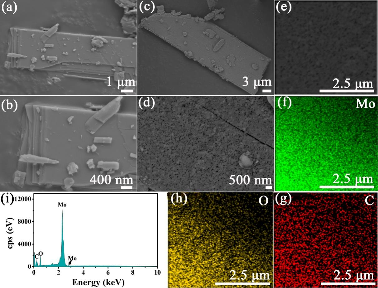 圖3 a-MoO3@Mo9O26和MoO2@C的SEM和元素組成分析