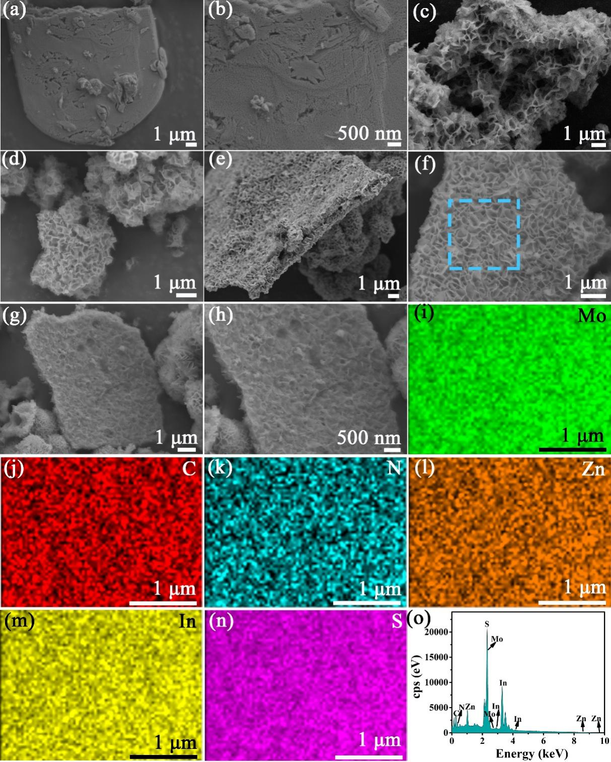 如圖2-5所示,通過(guò)SEM表征發現,在不加任何碳源下,MoO3在高溫下相轉換(huàn)得到的a-MoO3@Mo9O26呈(chéng)現表麵光滑的(de)二維納米(mǐ)片層(céng)。而Mo2C-N在高溫和Ar氣氛下煆燒時,構建了豐富的微觀孔隙結(jié)構,表明微觀形貌和活性(xìng)位點可以通過相變過程和碳源進行調節。Mo2C-N/ZIS呈現出具有周期(qī)性蜂窩孔結構的夾層納米(mǐ)結(jié)構,形成了良好的異質界麵,充分利用(yòng)了Mo2C-N/ZIS夾層納米結構的(de)優勢,促進了載流子在催化劑中的快速傳遞(圖2(e-f))。此外,在10-a-MoO3@Mo9O26/ZIS和10-MoO2@C/ZIS中出現了較大的孔隙結構(gòu)和界麵網(wǎng)絡結構的缺失,導致電子傳遞的能量壘增強(圖S4(a-c))。
