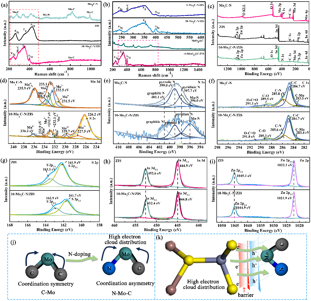 圖(tú)6所示,通過拉曼分析了Mo2C-N, ZIS和Mo2C-N/ZIS的組(zǔ)成及官能的成鍵情況。另外(wài),Mo 3d射線光電子能(néng)譜 (XPS)分析顯示(shì),Mo2C-N中Mo存在多種價(jià)態。在Mo2C-N上生長ZIS後,Mo 3d的結(jié)合能比純Mo2C-N向更(gèng)高的結合能方向移動。在Mo2C-N/ZIS複合材料中出現了兩個明顯的新峰,它們分別屬於S 2s (226.2 eV)和Mo2+ (227.5 eV),表明ZIS和Mo2C-N之間存在很強的界麵(miàn)相互(hù)作用。Mo-N、吡啶N、吡咯N和石墨N的衍射峰分別(bié)在396.0、397.7、399.0和401.1 eV,表明氮被成功地摻(chān)雜到碳的位置上。此外,對於C 1s的XPS光電子能譜,在(zài)283.5、284.7、285.8、289.5和291.1 eV的峰分別歸因於C- Mo、C-C、C- N、C-O和O-C=O的結合能,C 1s的強度(dù)顯著降低。N元(yuán)素的誘導打破了Mo-C鍵的平衡,導致電子在Mo位中心重新分布。值得注(zhù)意的是,與純ZIS相比(bǐ),S 2p、In 3d和(hé)Zn 2p的結合能都向較低的結合能方向移動,進一步驗證了Mo2C-N的協助有助於空穴向Mo2C-N的轉移,Mo2C-N/ZIS的肖特基結勢壘(lěi)可以限製電子的轉移,導致ZIS的電子雲分布較高。