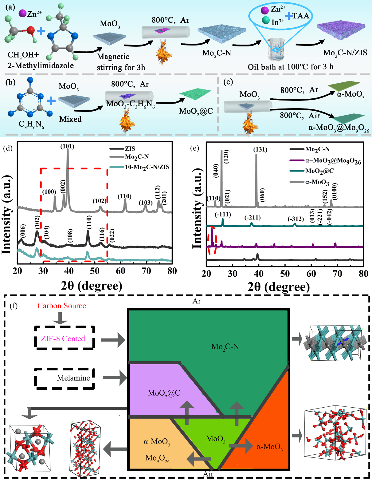 本文先通過熱處理得到Mo2C-N, 並結(jié)合油浴法將超薄ZIS納米片封裝在二維的Mo2C-N表麵。考慮到碳源和非均相的影響,采用鋅基沸(fèi)石型金屬有機(jī)骨架(jià)(ZIF-8)或三聚氰胺(àn)包覆的MoO3在氬(yà)(Ar)氣氛下高溫碳化以控製相轉化過程(圖1(a-c))。如圖1(d-e)所示,XRD結果表明MoO3-ZIF-8和MoO3-C3H6N6最終(zhōng)分別轉化為Mo2C-N和碳包覆二氧化鉬(MoO2@C)。圖1(f)解釋了在不(bú)同氣氛和條件下,MoO3在高溫相轉換過程形成的晶(jīng)體結構。