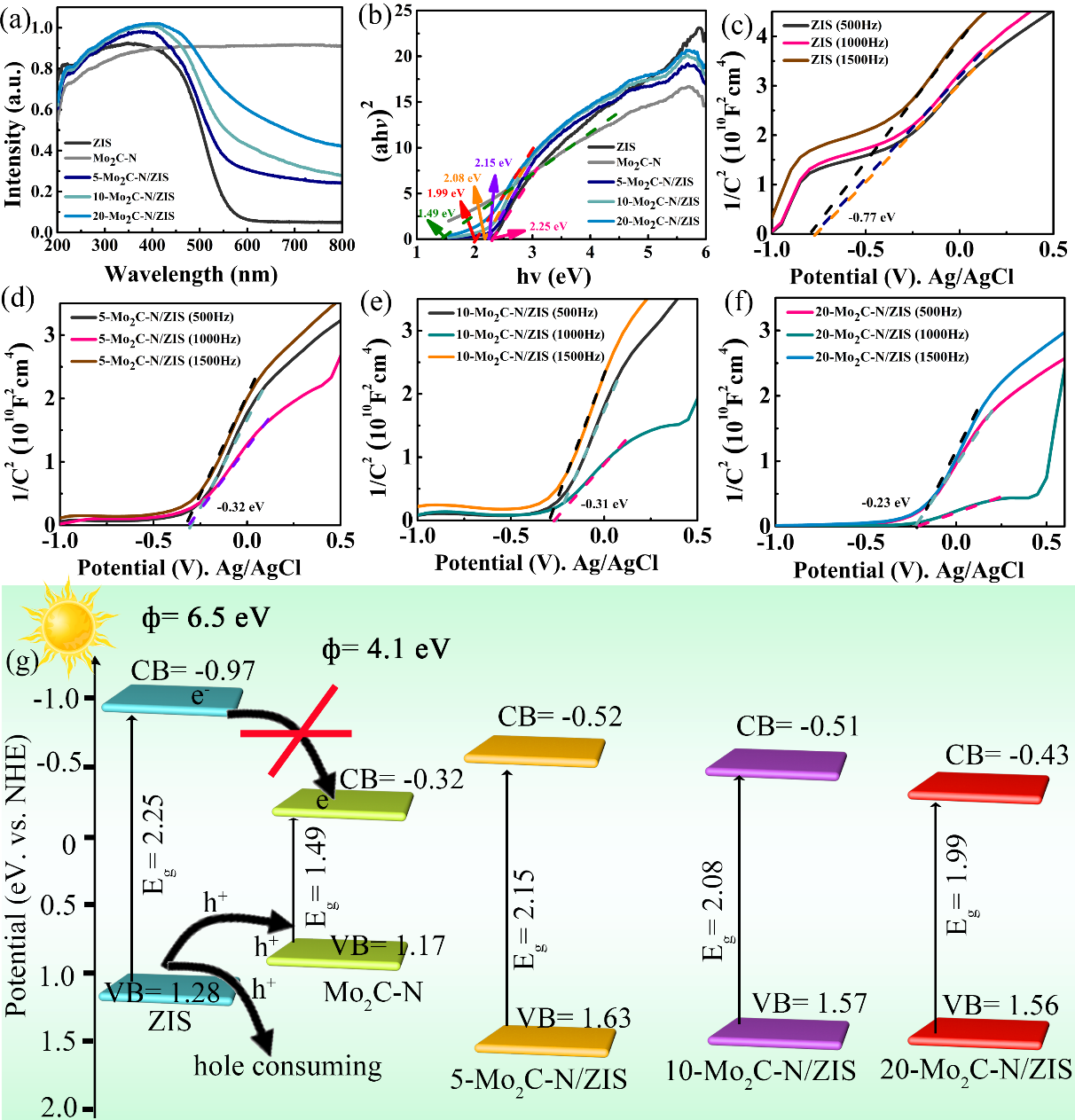 圖7 Mo2C-N, ZIS和Mo2C-N/ZIS的光學性能及能帶分析