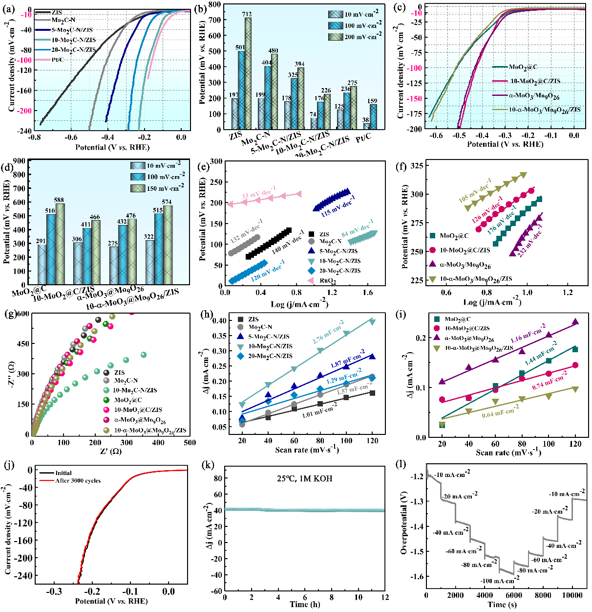 另外,HER和OER測試結果表明10-Mo2C-N/ZIS具有最突出的電催化活性,在電流密度為10 mA·cm-2, 過電位低至74 mV (HER) 和 250 mV (OER),減小的Tafel斜率值和增加的Cdl 表(biǎo)明(míng)Mo2C-N結合ZIS有(yǒu)效調節了HER/OER反應的限速步驟,並提高了(le)反應的活性位點,Mo2C-N/ZIS顯示出了極佳的穩(wěn)定性,在實際應用中具(jù)有潛(qián)力。
