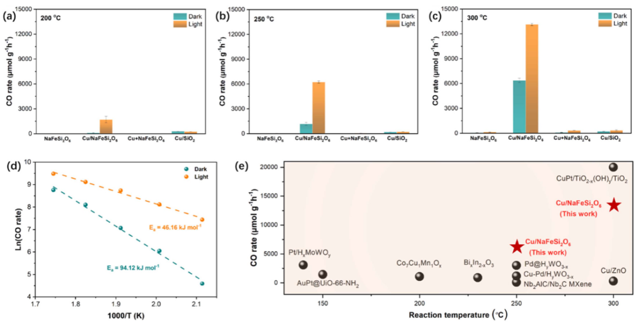 在流動相微反裝置測試了催化劑的光催化(huà)CO2加氫性能(圖3)。在200,250以及300 °C反應溫度下,Cu/NaFeSi2O6催(cuī)化劑表現出逐漸增(zēng)強的CO生成速率,且光響應顯著。同等反應條件下,Cu/NaFeSi2O6催(cuī)化劑的催化活性顯著優於單一催化劑(jì)、物理(lǐ)混合催化劑以及Cu/SiO2對比催(cuī)化劑。在300 °C 加光條件下,Cu/NaFeSi2O6催化劑的CO生成速率達到最大值(zhí),優於大多數當前報道的催化劑。進一步,我們考察了(le)不同(tóng)Cu負載量的影(yǐng)響,發(fā)現(xiàn)15%Cu負(fù)載效果最佳,這可能是由於該負載濃度能(néng)夠(gòu)得到具有最佳Cu顆粒大小和分散度的催化(huà)劑。該催化劑在反複光照開/關以及(jí)長時間活性(xìng)測試條件下保持良好催化活性,顯示出優異的活性穩定性(圖4)。