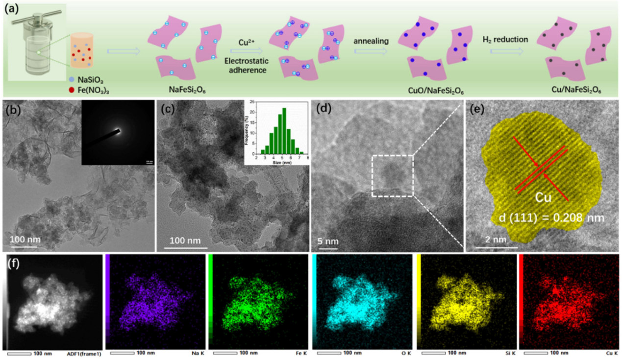 本文采用水熱法先製備出NaFeSi2O6納米(mǐ)片,再將Cu2+通過靜電(diàn)吸附作用錨定在納米片表麵(miàn),隨後(hòu)經(jīng)曆煆燒和還原合成出Cu/NaFeSi2O6催化劑(圖(tú)1)。TEM、HRTEM以及mapping可以看出Cu納米顆粒高度分散在NaFeSi2O6納米片表麵,兩(liǎng)者具有強的界麵相互作用。