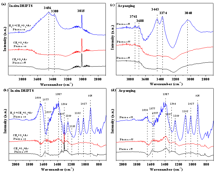 2. 等離子體原位紅外和原位原子發射光(guāng)譜表征結果(guǒ)證明:水蒸氣促進了化學吸附的烴類物質的選擇性(xìng)氧化。