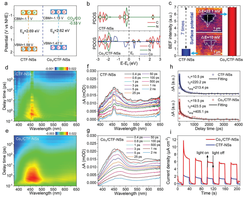 圖(tú)4  Co1/CTF-NSs的能帶結構、PDOS圖、表麵電勢圖像、fs-TA光譜和光電流曲線,這些結果(guǒ)表明了突出的Co極化場加速(sù)了電荷分離和轉移速率。