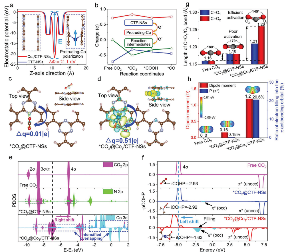 5 通過理論計(jì)算,展示了Co1/CTF-NSsCO2的吸(xī)附和活(huó)化過程,以及突出的Co極化場促進電(diàn)子從CTF-NSs轉移到吸附的CO2中間體。