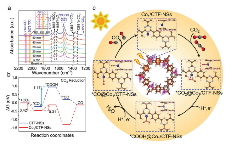 6 利用原位漫反射紅外光譜(DRIFT)監測了光催化CO2還原過程中的反應中間體,提出了Co1/CTF-NSsCO2光還原的可能機製