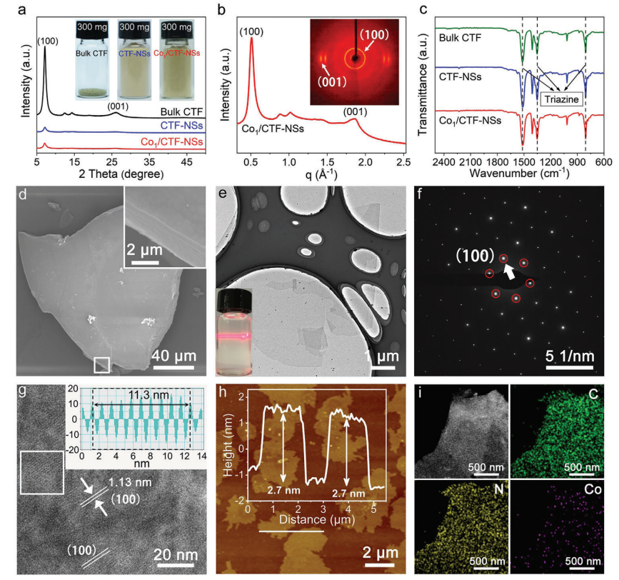 1 利用PXRD, 2D WAXSFT-IR證實了Co1/CTF-NSs的晶體結構和化學組成。利用SEM, TEM, SAED, HRTEM和(hé)AFM證實了Co1/CTF-NSs的形貌。
