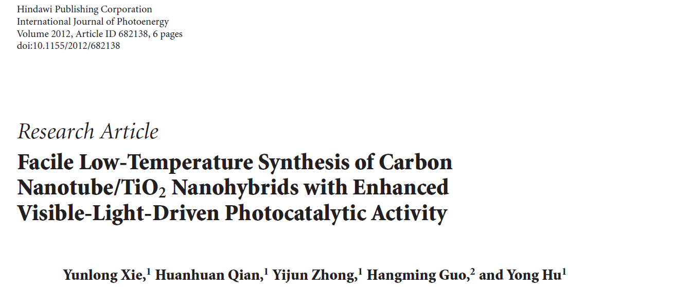 當前位(wèi)置 : 首頁(yè) > 資訊動態(tài) > 論文發表 > Facile Low-Temperature Synthesis of Carbon Nanotube/TiO2 Nanohybrids with Enhanced Visible-Light-Driven Photocatalytic Activity