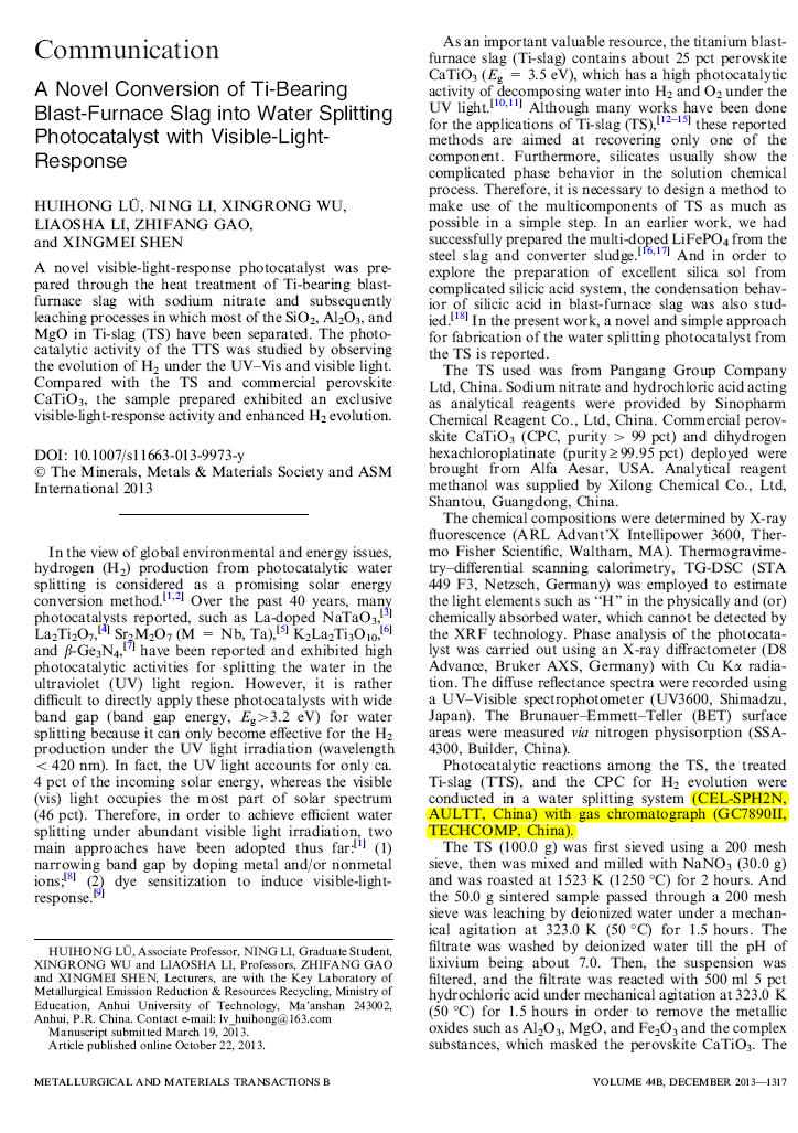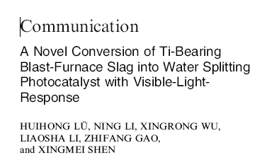 當(dāng)前位置(zhì) : 首頁 > 資訊動態 > 論文發表 > A Novel Conversion of Ti-Bearing Blast-Furnace Slag into Water Splitting Photocatalyst with Visible-Light- Response