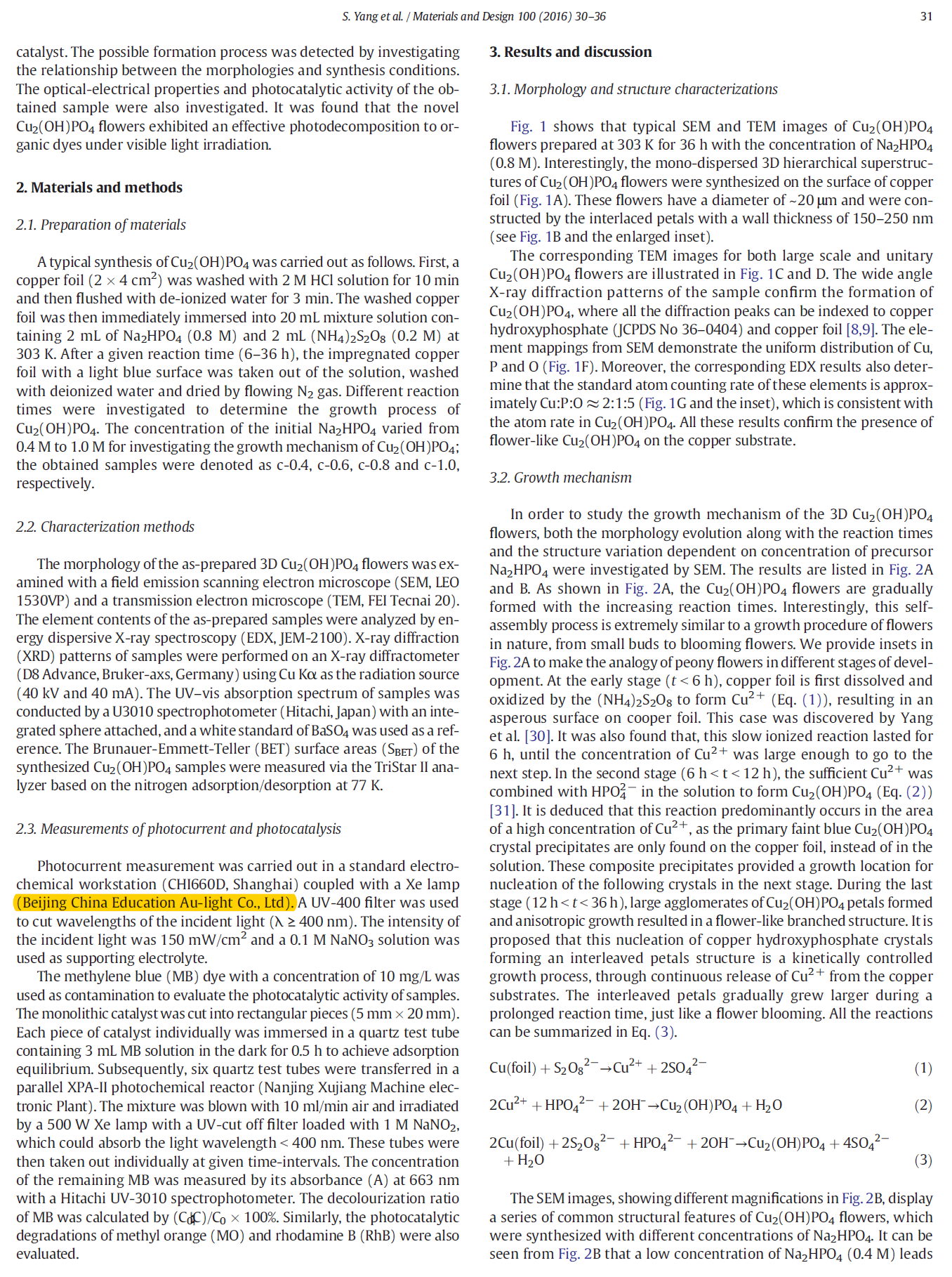 當前(qián)位(wèi)置 : 首頁 > 資訊動態 > 論文發表 > Solution growth of peony-like copper hydroxyl-phosphate (Cu2(OH)PO4) flowers on Cu foil and their photocatalytic activity under visible light