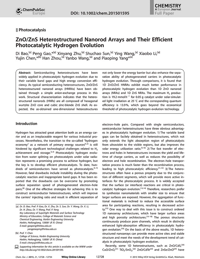 當(dāng)前位置 : 首頁 > 資訊動態 > 論文發表 > ZnO/ZnS Heterostructured NanorodArraysand Their Efficient PhotocatalyticHydrogen Evolution