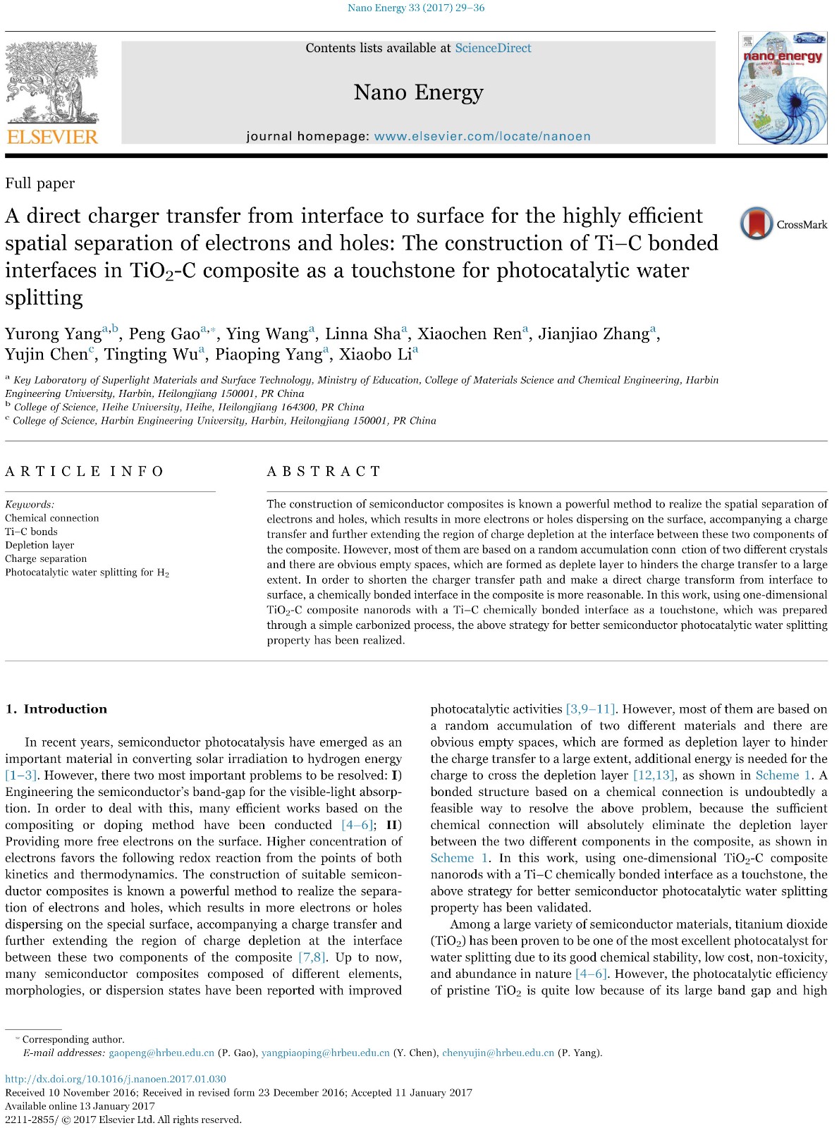 當前位置 : 首頁 > 資(zī)訊動態(tài) > 論文發表(biǎo) > A direct charger transfer from interface to surface for the highly efficient spatial separation of electrons and holes: The construction of Ti–C bonded interfaces in TiO2-C composite as a touchstone for photocatalytic water splitting