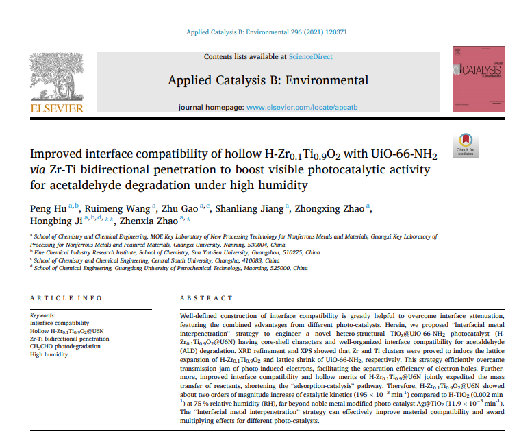 近日,廣(guǎng)西大學趙禎霞教授,中山大學紀紅兵(bīng)教授報道了提出了“界麵金屬互穿”策略來設計一種新型的異質結構TiOx@UiO-66-NH2光催化劑(H-Zr0.1Ti0.9O2@U6N),該催化劑具有核殼結構特征和良好的界麵(miàn)相容性(xìng),可(kě)用於乙醛的降解。