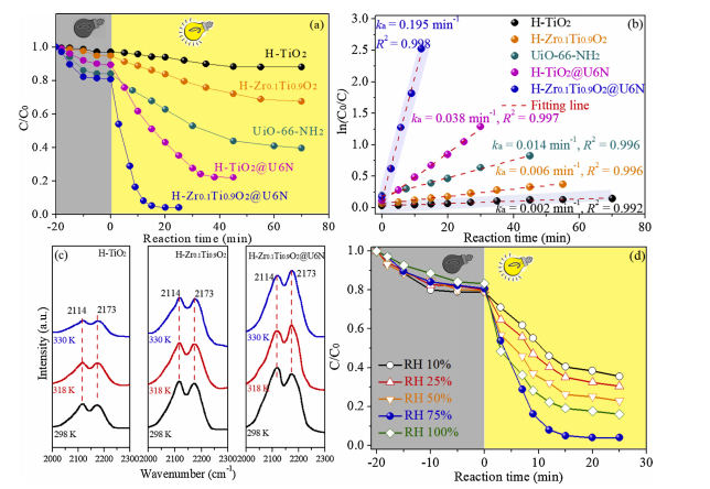要點3. 實驗結果顯示,在75%相對濕(shī)度(RH)下,H-Zr0.1Ti0.9O2@U6N的催化(huà)動力學(195×10-3 min-1)比H-TiO2(0.002 min-1)提高約兩個數量級,並遠遠超過貴金屬改性光催化劑Ag@TiO2(11.9×10-3 min-1)。