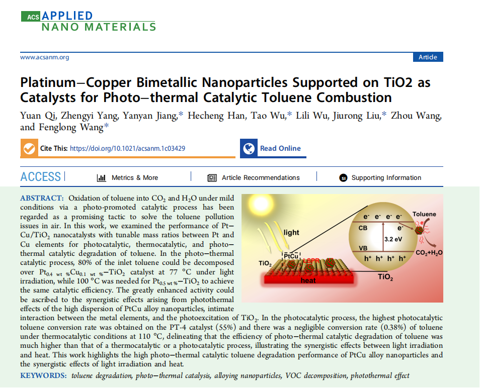 標題:Platinum−Copper Bimetallic Nanoparticles Supported on TiO2 as Catalysts for Photo−thermal Catalytic Toluene Combustion