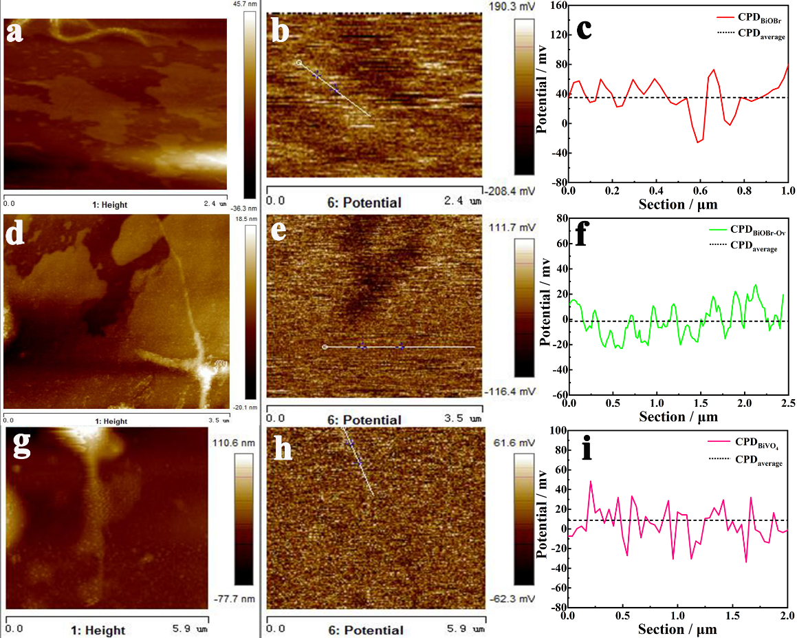 開爾文(wén)探針力(lì)顯微鏡 (KPFM) 技術和密度(dù)泛(fàn)函理(lǐ)論(lùn) (DFT) 計算表明(míng),氧空位的引入調節(jiē)了 BiVO4 和 BiOBr 之(zhī)間費米能級的相對位置。我們最終結合了 DFT 計算、能帶分析、俘獲實驗和電子順磁共振(zhèn) (EPR) 結果,證實了氧空位的存在導致光生載流子傳輸路徑從 II-型到 Z-型的改(gǎi)變。這項工作為氧空位協調界(jiè)麵電荷轉移途徑提供了見(jiàn)解和指導。