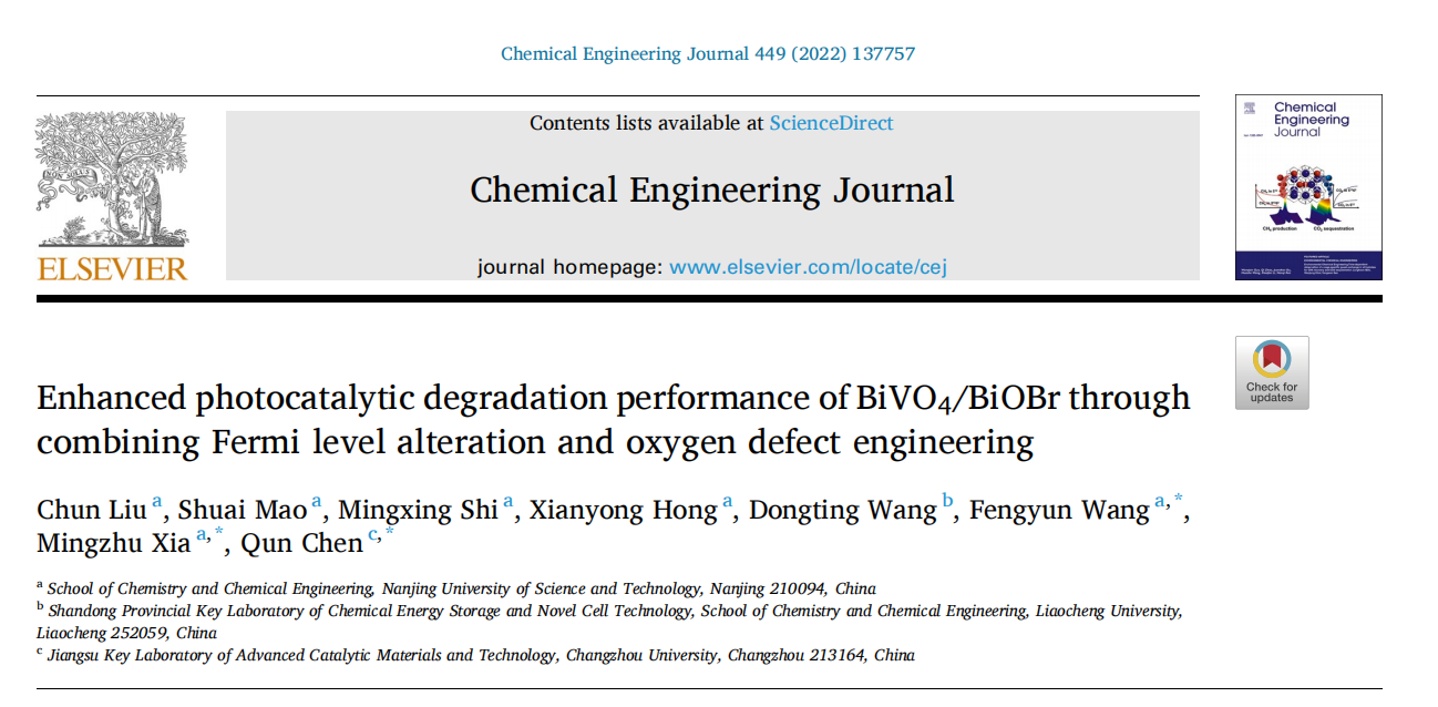 標題:Enhanced photocatalytic degradation performance of BiVO4/BiOBr through combining Fermi level alteration and oxygen defect engineering