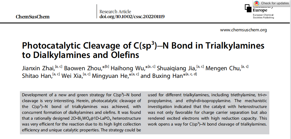 發展一種無毒綠色的C-N鍵斷裂的方法具有重要意義。我們製備了一種(zhǒng)2D-Bi2WO6@1D-LaPO4異質結(jié)光催(cuī)化劑(jì),其可以對不同的三(sān)烷基胺進(jìn)行(háng)光催化C(sp3)-N鍵斷裂生成二級(jí)胺和對應烯烴。一係(xì)列結果表明,磷酸鑭的引入能夠與鎢酸鉍結合形成獨特的“熱”電子轉移機製,從而改變載流子行為促進三烷基胺的C(sp3)-N鍵斷裂;同時該現象也有別於常見以三級胺為犧牲試劑進行光催化二氧(yǎng)化碳還原的工作,通(tōng)過GC-MS等手(shǒu)段表(biǎo)明烯烴的來源是三烷基胺而非二氧化碳。