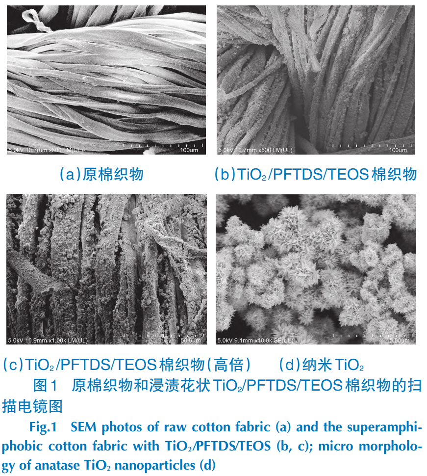 GUO等人[16]通過在棉織(zhī)物表(biǎo)麵包覆蓬鬆的球形 SiO2納米顆粒(lì),再進一步用低表麵能材料含氟化合物改性,獲得雙層微/納米結構的(de)多功能超拒液棉織物。TiO2因優異的光電化學特性和經濟效(xiào)益高(gāo)[17-18],在紡(fǎng)織領域常(cháng)用於光催化降解有機汙(wū)染物,以(yǐ)及(jí)抗菌和抗紫外線(xiàn)產(chǎn)品[19-20]。織物表麵沉積TiO2納米顆粒的(de)研究不在少數(shù),但對多(duō)層次的TiO2與含氟低表麵能材料共(gòng)摻雜構築的超雙疏與光催(cuī)化棉織物的研究還沒有報道(dào)。