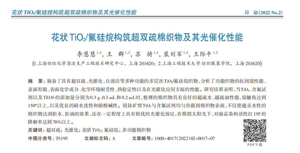 中文(wén)標題: 花狀TiO2/氟矽(guī)烷構築(zhù)超雙(shuāng)疏棉織物及其光催化性能