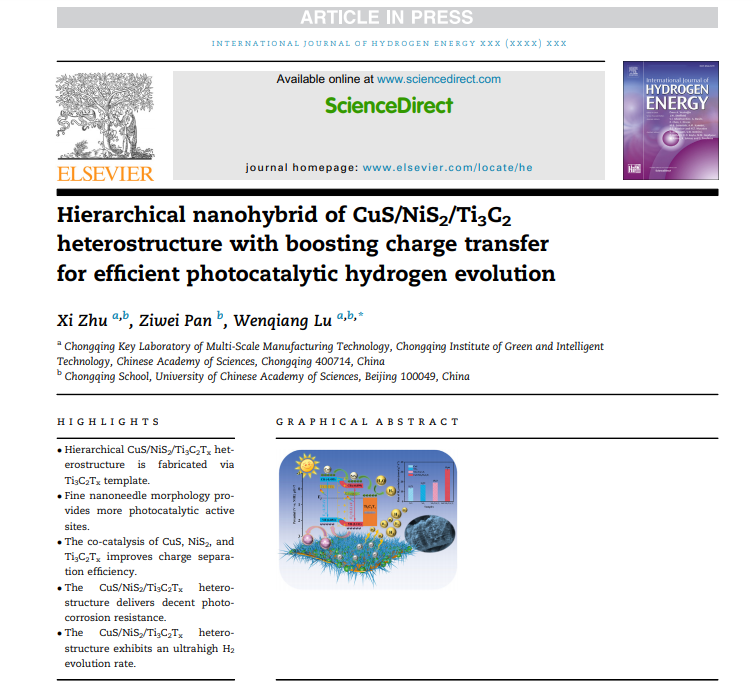 標(biāo)題:Hierarchical nanohybrid of CuS/NiS2/Ti3C2 heterostructure with boosting charge transfer for efficient photocatalytic hydrogen evolution