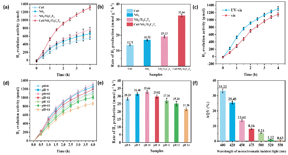 圖3 (a和b)CuS、NiS2、NiS2/Ti3C2Tx和CuS/NiS2/Ti3C2Tx異質結構的(de)光催化產(chǎn)氫性能和產氫速率;(c)CuS/NiS2/Ti3C2Tx異質結構在紫(zǐ)外-可見光和可見光下(xià)的產氫性能;(d和e)CuS/NiS2/Ti3C2Tx異質結構在不同(tóng)pH條件(jiàn)下的光催化產氫性能和(hé)產氫速率;(f)CuS/NiS2/Ti3C2Tx異質結構的AQY值