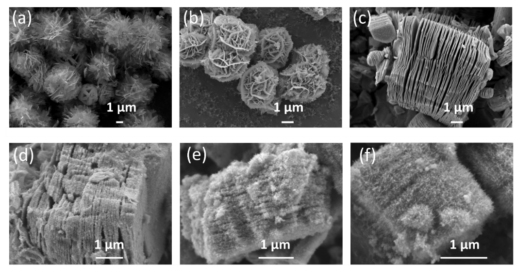 圖2 (a)CuS、(b)NiS2、(c)Ti3C2Tx、(d)NiS2/Ti3C2Tx異質結構和(e和f)CuS/NiS2/Ti3C2Tx異質結構的SEM圖