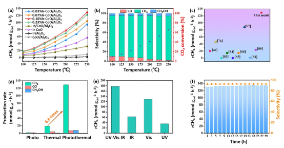 圖2、(a)催化劑在不同反應溫度下的CH4產率;(b) 0.16%Ir-CoO/Al2O3催化(huà)劑在不同反(fǎn)應(yīng)溫度下的產物選擇性(xìng)和CO2轉化率;(c)本工作(zuò)與以往其他文獻中CH4產生速率的比較;(d) 0.16%Ir-CoO/Al2O3催化劑在不同條件下產物的產率;(e) 0.16%Ir-CoO/Al2O3催化劑在不同光照(zhào)條件下的CH4產率;(f)穩定性測試。
