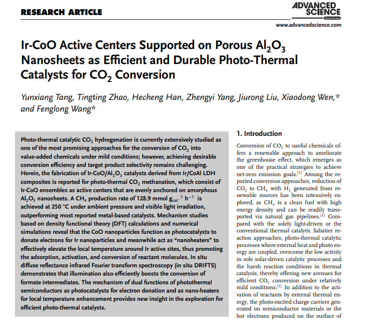 綜上所述,本文製(zhì)備了Ir-CoO/Al2O3催化(huà)劑,在溫和條件下實現了高效光(guāng)熱催化CO2甲烷化。此外,該工作還采用了原位紅外光譜與理論計算揭示了CO2甲烷化反應機理。該研究提出了光熱半導體作為提供電子的光催化劑和作為局部溫度增強的納(nà)米加熱器的雙重功能機製,為探索高效光熱催化劑提供(gòng)了新(xīn)的思路。