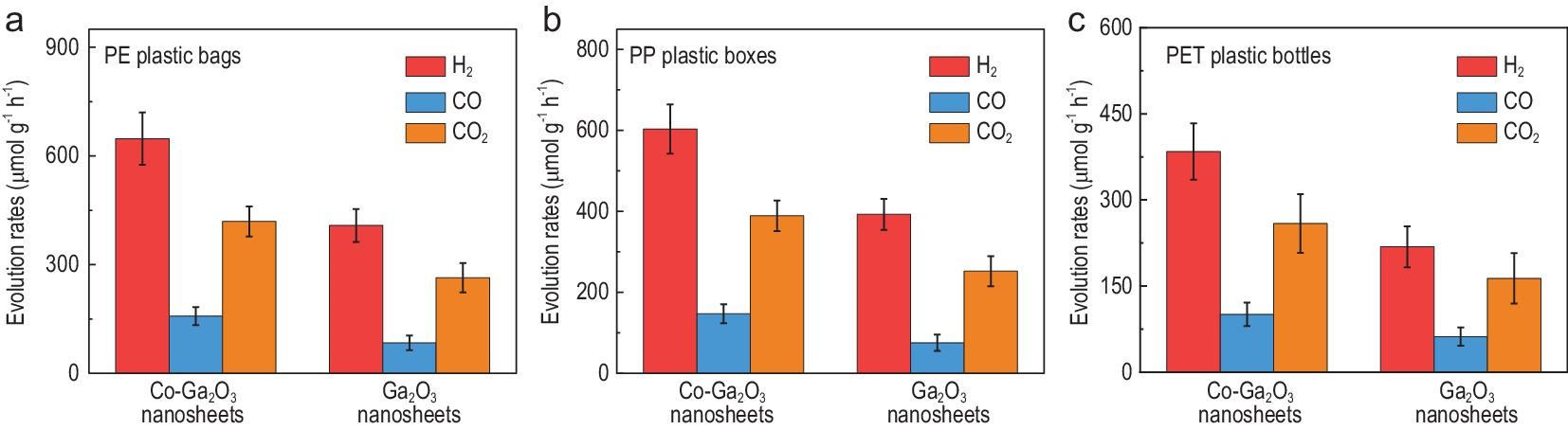 合(hé)成氣的主要成分(fèn)為一氧化碳(CO)和氫氣(H2),它(tā)是一種重要的化工原料。基於此,研究(jiū)人員提出了一種綠(lǜ)色環保(bǎo)的策略,在(zài)常(cháng)溫和常壓下(xià),借助(zhù)水將塑料垃圾通過光照轉化為清潔、可再生的合成氣。在該工藝中,H2O會被還原為H2,而各種塑料製品,如聚乙烯(PE)塑料袋、聚丙烯(PP)塑料(liào)盒、聚對苯二甲酸乙二醇酯(PET)塑料瓶等可以被光降(jiàng)解為CO。與耗時的塑料自發降解相比(bǐ),該策略利用太(tài)陽光和合適(shì)的光催化(huà)劑實現了塑料的高效降解,而生成的合成氣又可(kě)以通過費(fèi)托合成或者聚合過(guò)程(chéng)得到全新的塑料製品。以PE塑料袋為例,Co-Ga2O3納米片可以高效地將其轉化為(wéi)合成氣(qì),其中(zhōng)H2和CO的生成速率分別為647.8 μmol g-1 h-1和158.3 μmol g-1 h-1。