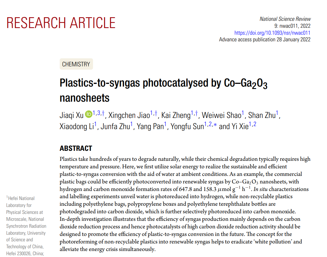標題:Plastics-to-syngas photocatalysed by Co–Ga2O3 nanosheets