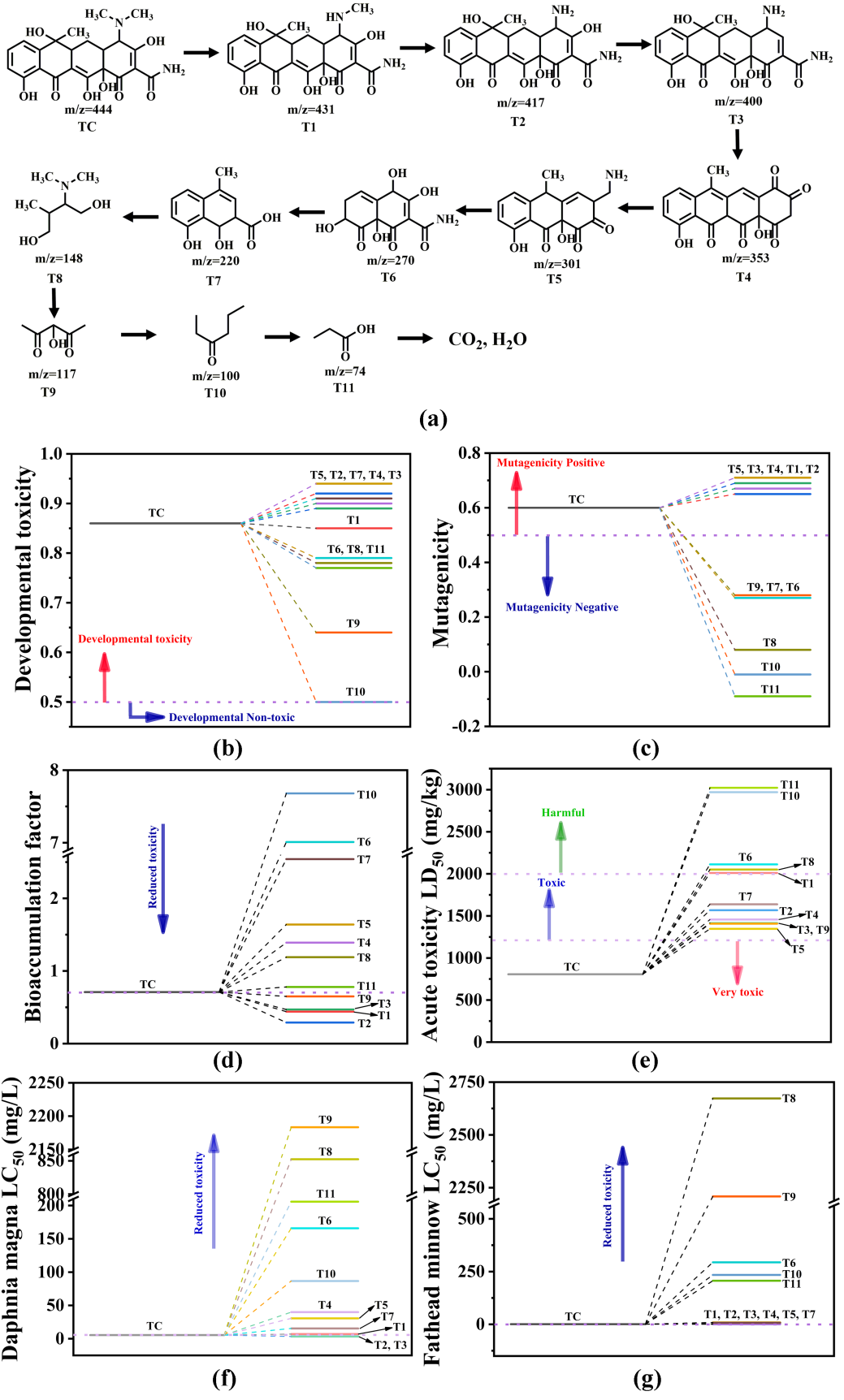 基於高效液相色譜(pǔ)-質譜對降解產物的鑒定,建立了(le)可(kě)能的TC降解途徑。TC分子(zǐ)經逐步開環閉環等一係列反應(yīng)為小分(fèn)子。此外,利用毒性評估軟件工具 (TEST) 和(hé)定量構效關係 (QSAR) 的數學模型對TC降解中間體的毒性進行了評估。毒性評價包(bāo)括致死濃度50% (LC50) (96 h) 大鼠的發育毒性和致突變性等。大多數發育毒性和致突變性都有所降低。這些數據表明(míng),通過(guò)光降解過程降低了TC的毒(dú)性,但(dàn)某些降解中間體的毒性仍然存(cún)在。因此,延(yán)長降解時間,使TC完全分解為CO2和H2O,進(jìn)一步降低光降解過程中的毒性是(shì)至關重要的。